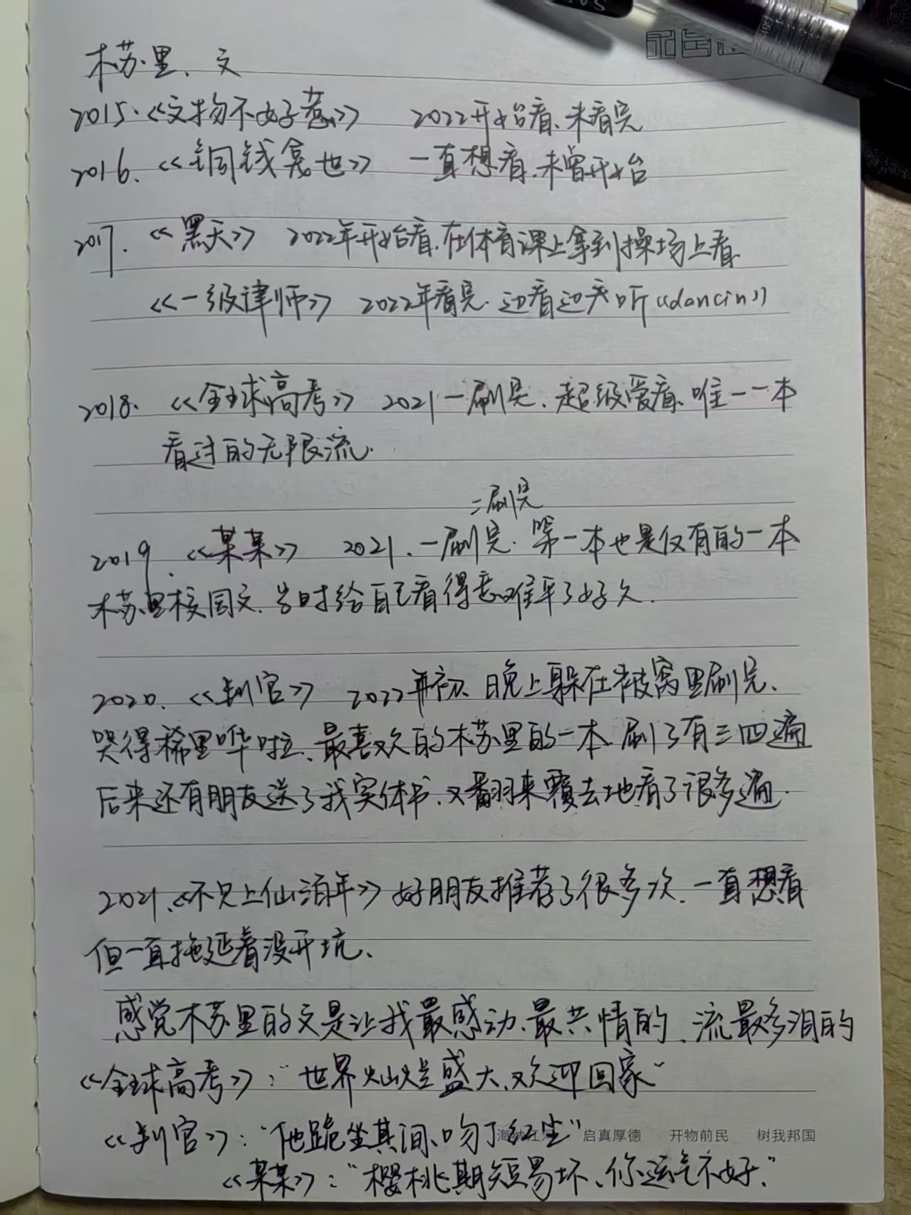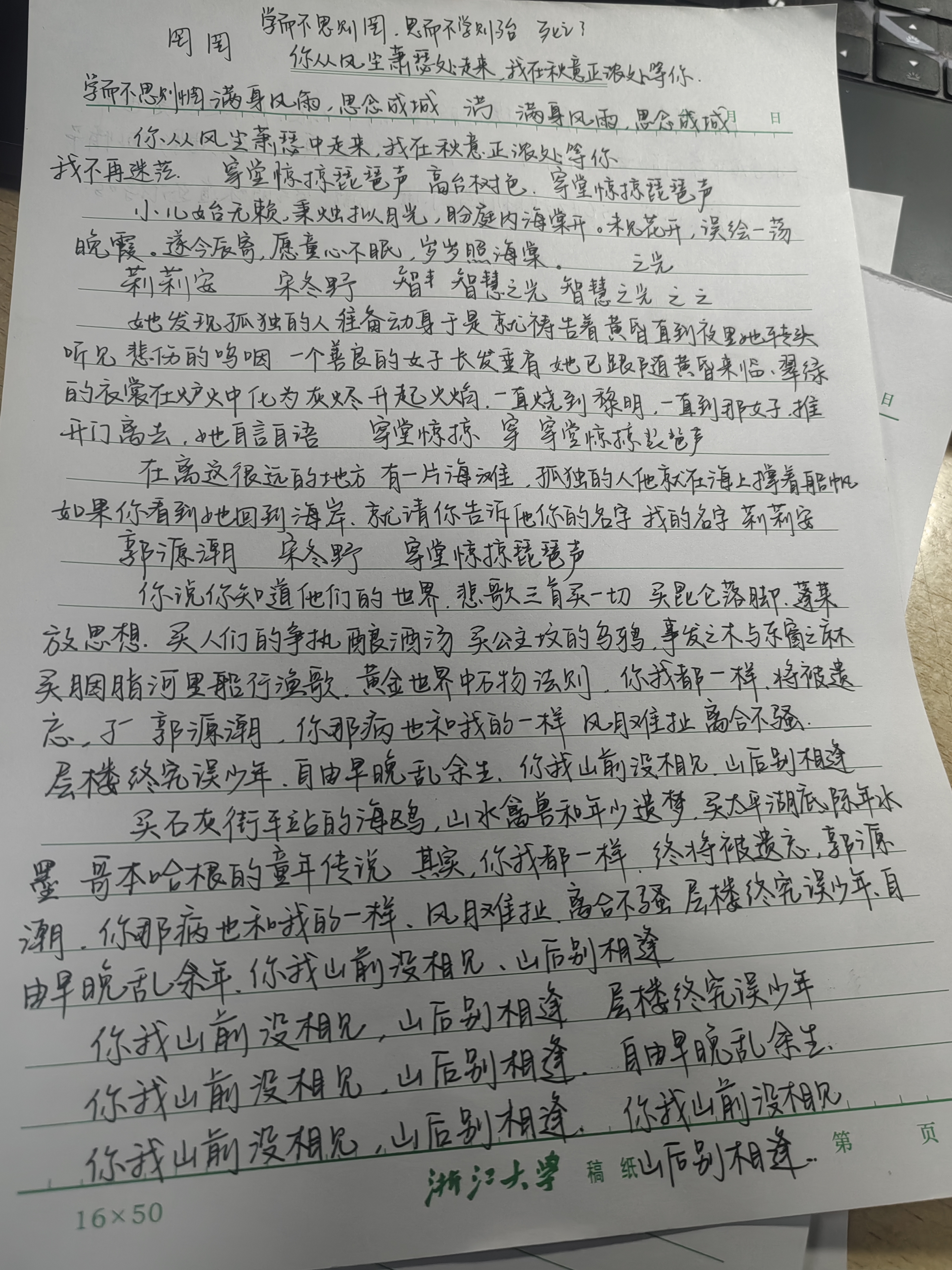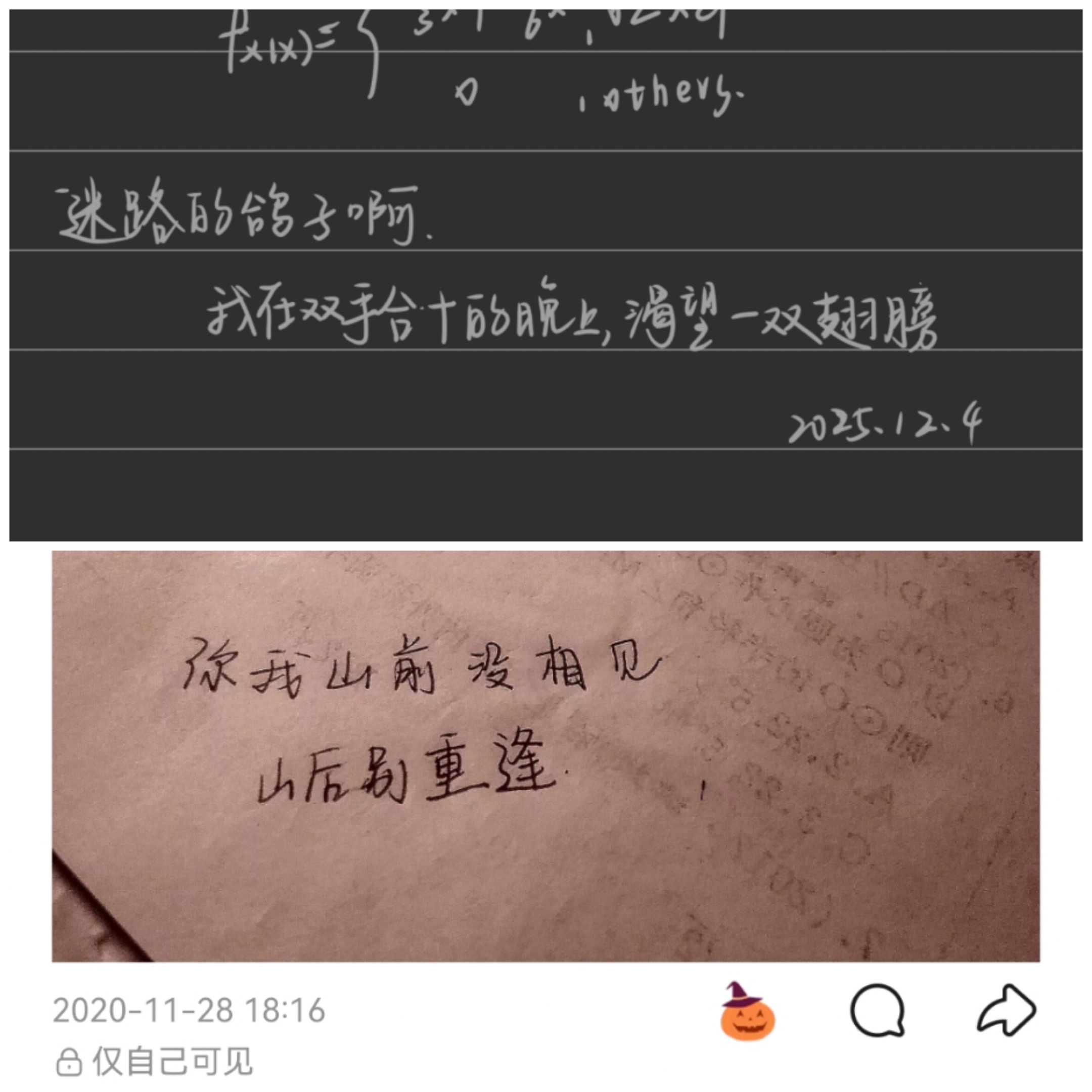 智慧树刷完了以后,实在看不动屏幕了,就拿了几张纸,漫无目的地写了起来,也是我的一个小习惯吧。高中时候经常白天考一整天,晚上讲卷子,最后一节到十点多的自习上,我的精力实在跟不上,所以就开始在卷子上认真写字假装学习。老师远远看去也不知道我在干啥,只有近看才能发现是在写歌词,和小说里很喜欢的句子。